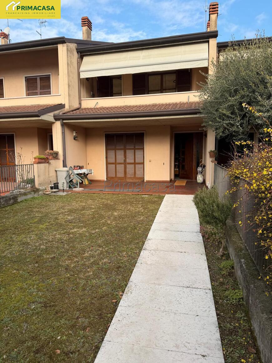 In zona residenziale e tranquilla proponiamo in vendita villetta a schiera centrale con giardino di proprietà fronte retro attualmente divisa in due unità abitative con possibilità di ripristinarla ad una unica. Al piano terra troviamo la prima unità composta da una zona giorno con cucina a vista, una camera da letto e un bagno con box doccia. Al primo livello troviamo la seconda unità abitativa con soggiorno e cucina a vista, due camere matrimoniali, un bagno finestrato con box doccia e all'ultimo livello un'ulteriore camera da letto matrimoniale con bagno finestrato. Completa l'unita il piano interrato con bagno cieco uso lavanderia, una cantina, una taverna ed un garage triplo.